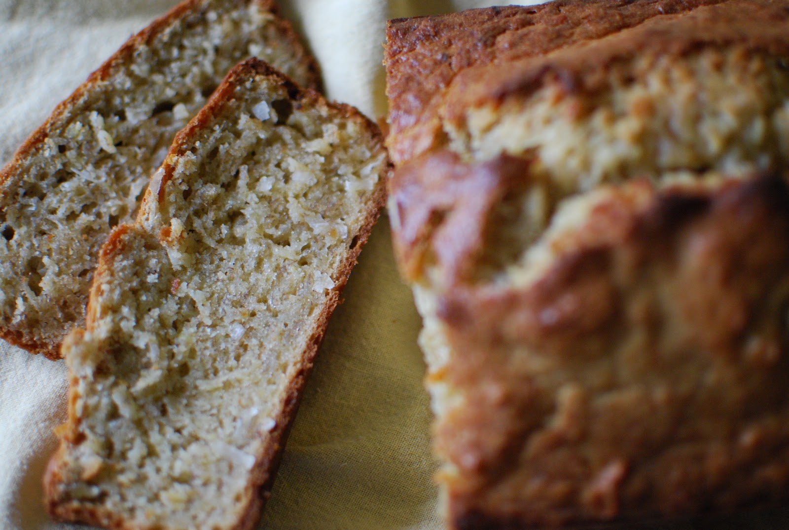 Mix together the dry ingredients. Cream the butter and beat in the eggs and bananas. Stir this mixture into the dry ingredients; do not mix more than necessary. Gently stir in the vanilla, nuts, and coconut.